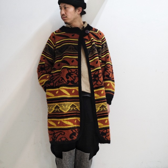 緩やかに膨らむシルエットのコクーンコート。 ギリシャ文様をベースにアフリカンバティックを融合した様な独特なエスニックデザインは他にない特筆したデザイン。 ウール一枚仕立てな為、見た目以上にライトな作りなっているので、今みたいな肌寒いな時期から春先にも対応できるマルチな存在。 春先も考えたいけど、今の寒さにも使いたいという欲張りな方への願いを叶えられるコートです。 リブなので、袖の長さを気にしないで済むからジェンダー関係なくおすすめです。 イタリアレザータンニンなめし協会からのウールコートという非常に稀有な出自なのも面白いところ。 【採寸】 肩幅 - 着丈 92㎝ 身幅 66㎝ 裄丈 68㎝ model 178㎝ / 72kg 古着の為、多少のダメージがあります。そちらの方をご了承の上、お取り引き宜しくお願い致します。 ※返品、交換はお受け致しません。 ※入金確認が完了するまで、店頭販売を優先させて頂いております事予めご了承ください。 お取引中に完売してしまった場合は頂いている情報を元にメールにてご連絡致します。