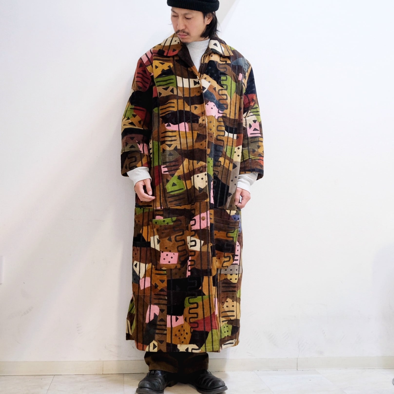 SHERMARKE Nuback Leather "Patchwork" Crazy Pattern Maxi Length Coat