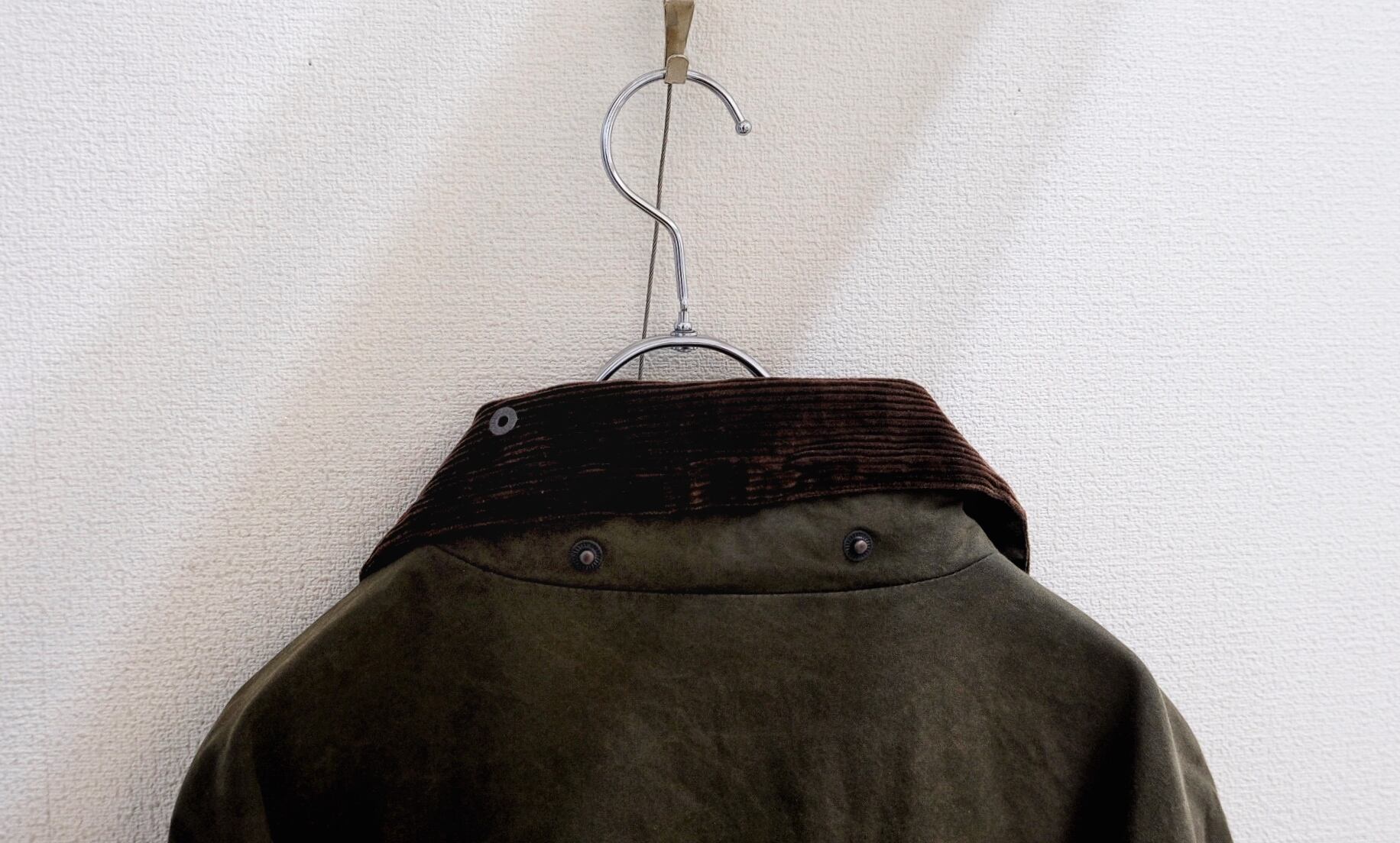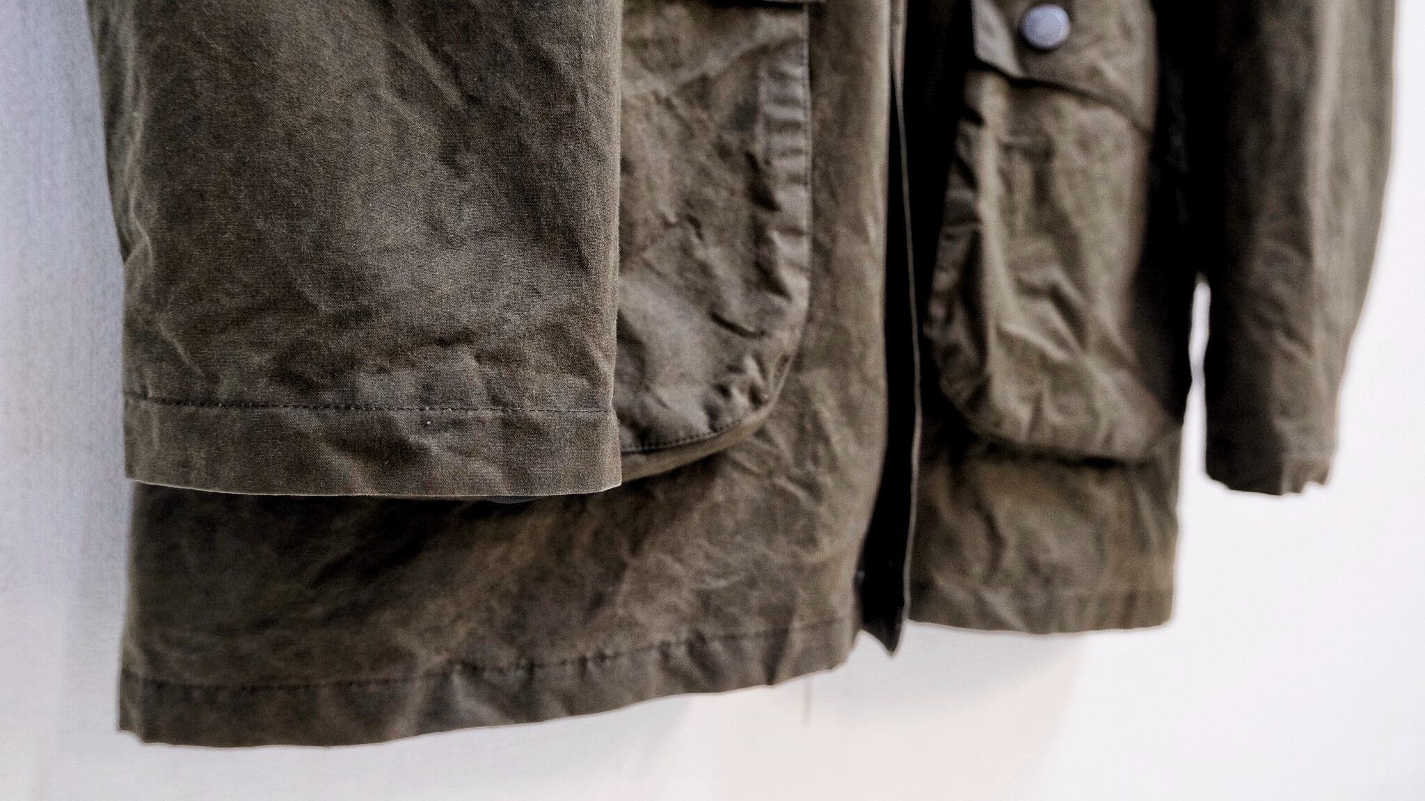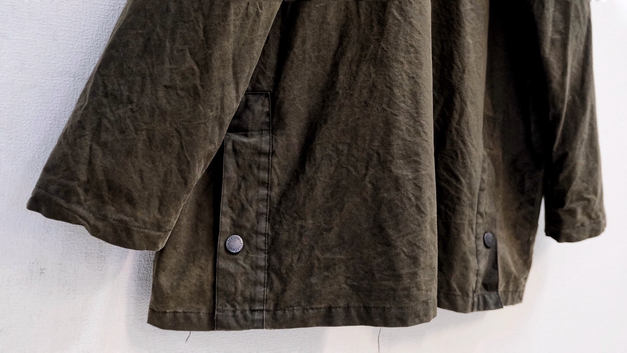 象徴であるオイルドコットンをはじめ、首元からの風の侵入を防ぐ、チンストラップ、しゃがんだり、座る際に広げてストレスを与えない裾にあるインバーテッドプリーツとタウンユースにも十二分に発揮できる機能的なディテール。
