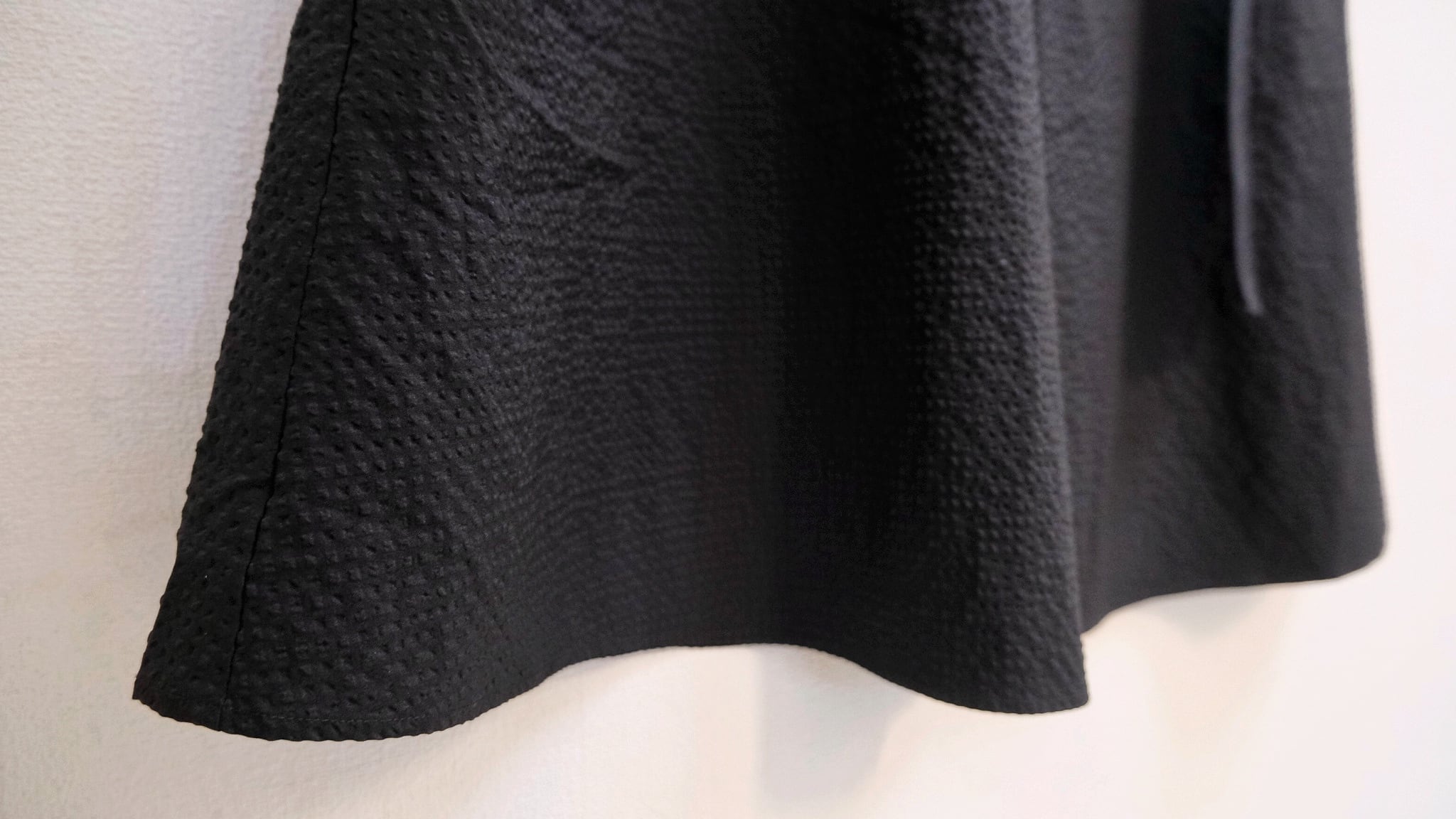 ワッフル状に仕立て、立体的な凹凸にする事で擦れを軽減し、履きやすくしているテック素材なスカート。