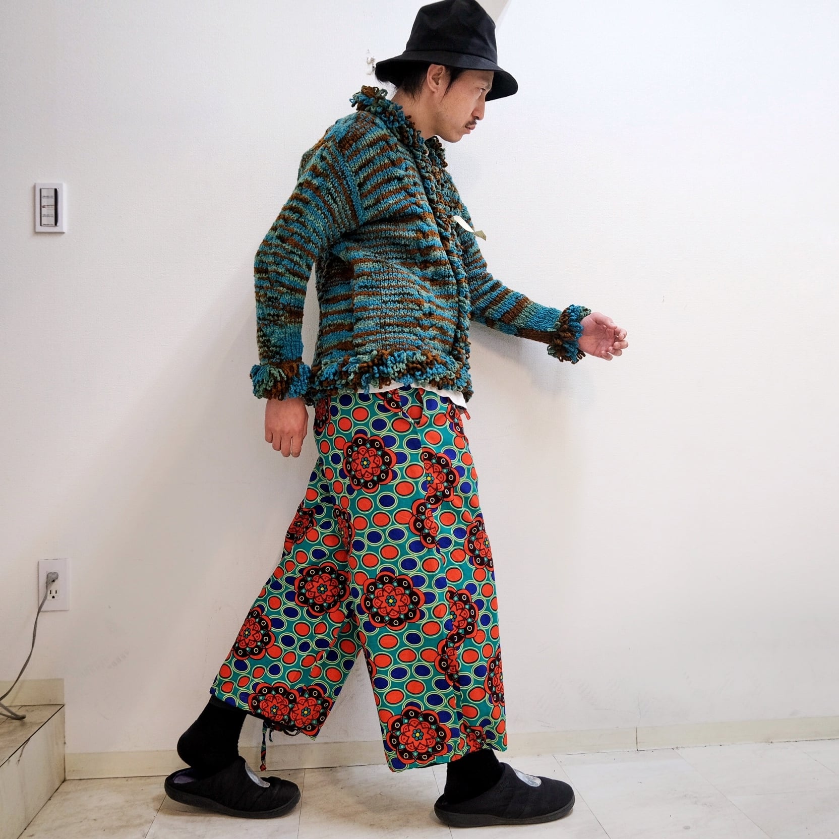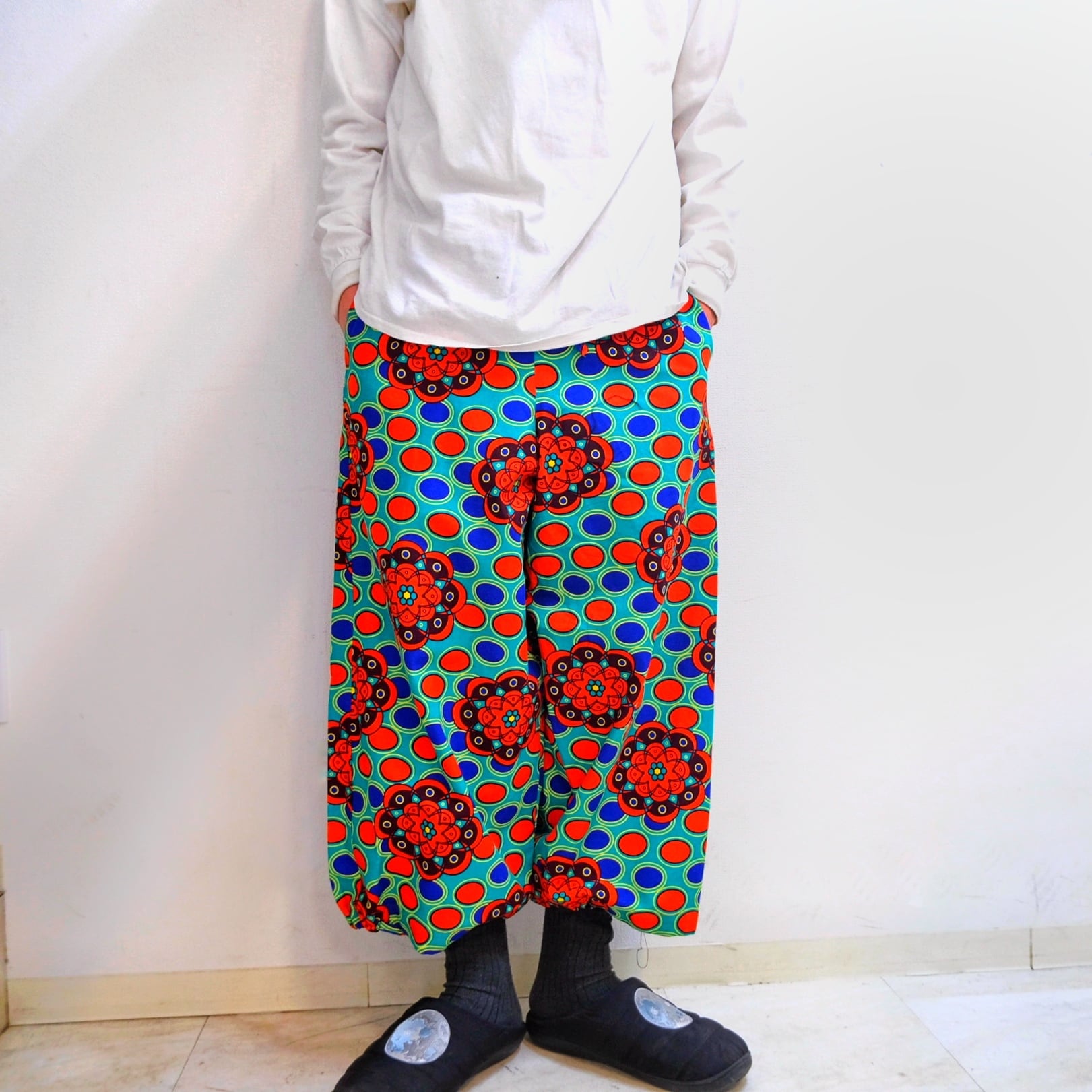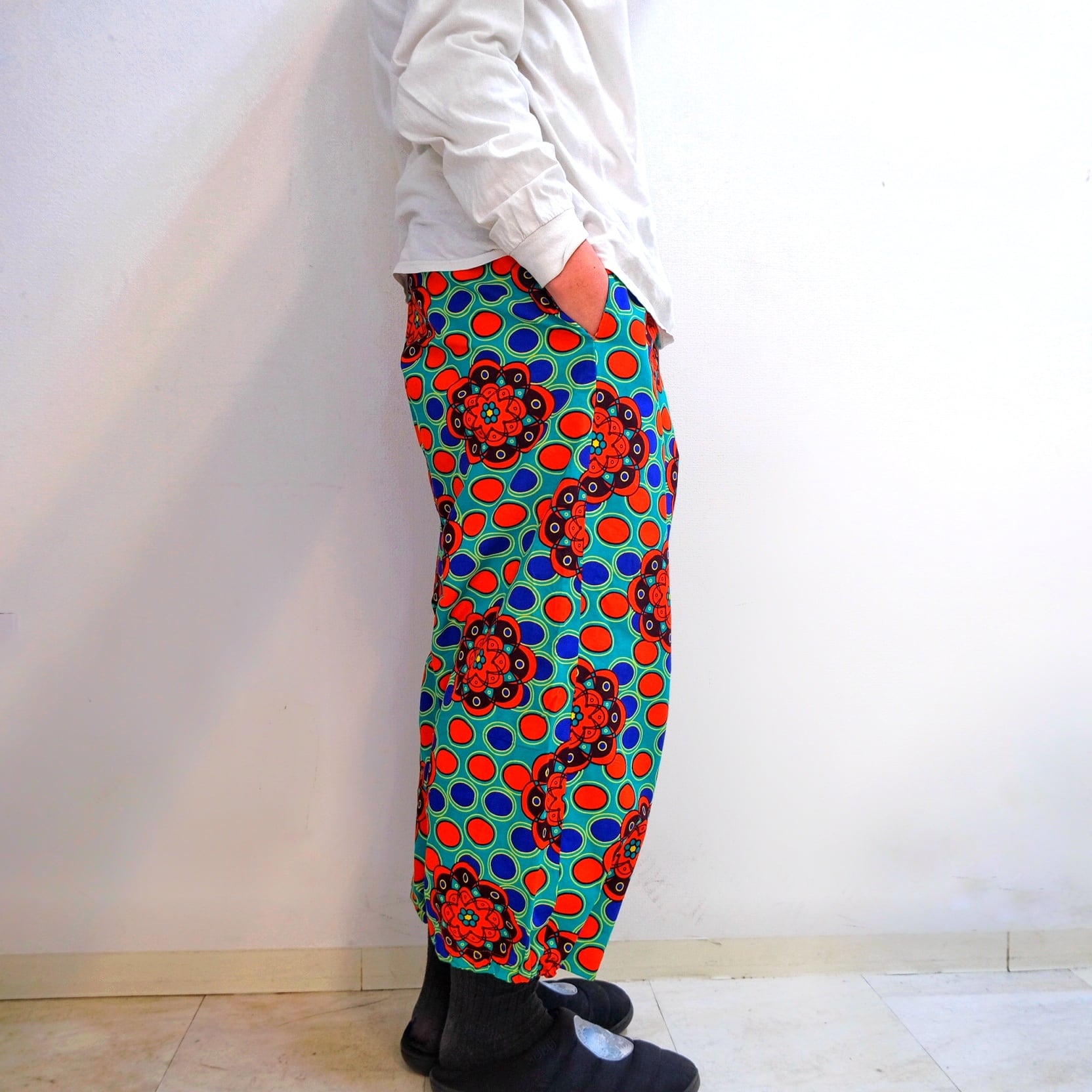 敢えてのクロップド丈にワイドなシルエットは主張の強いこな柄に最高に良いカタチ。