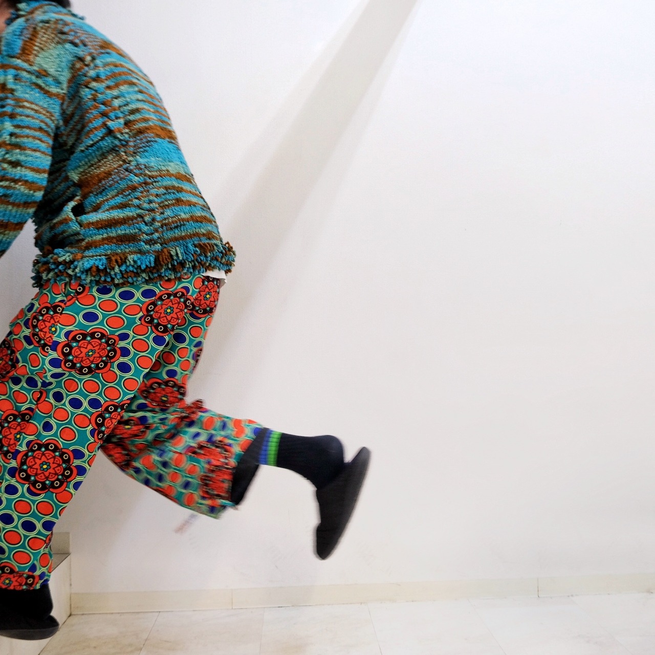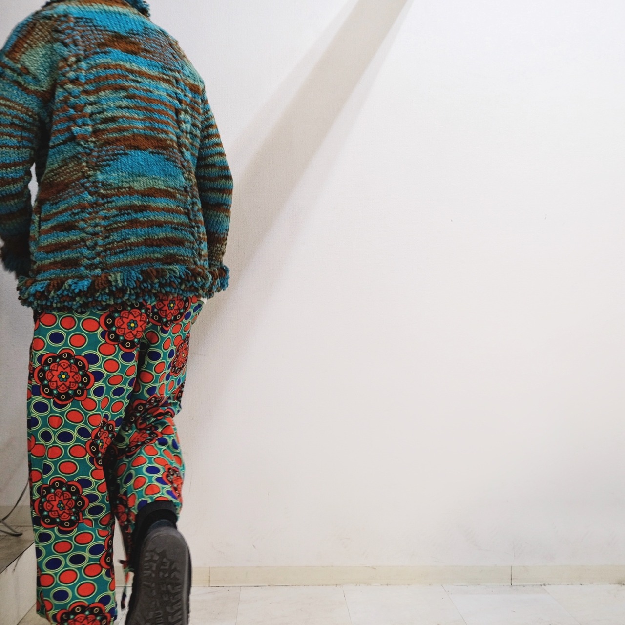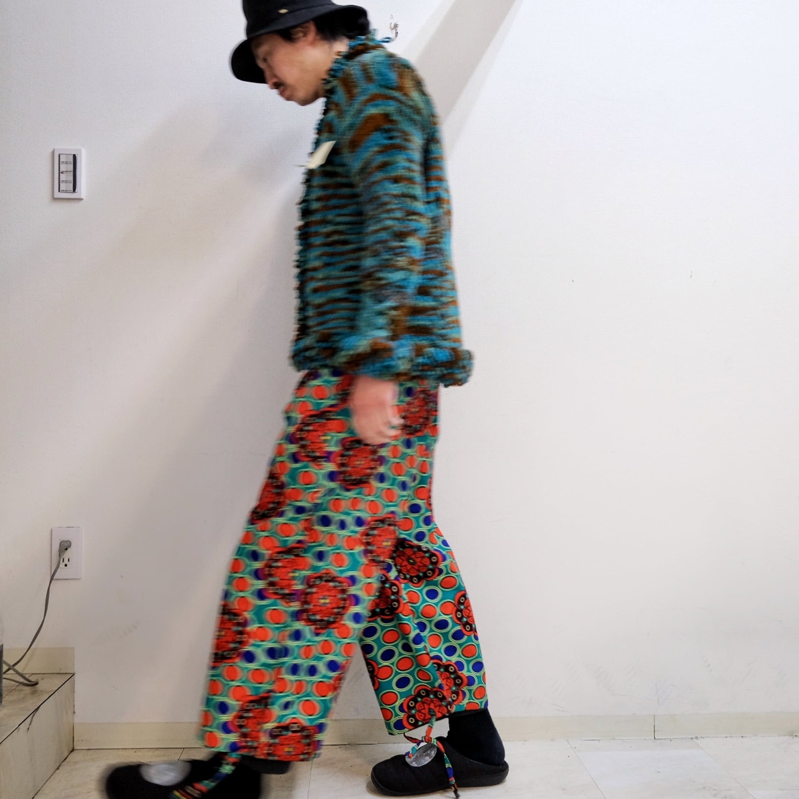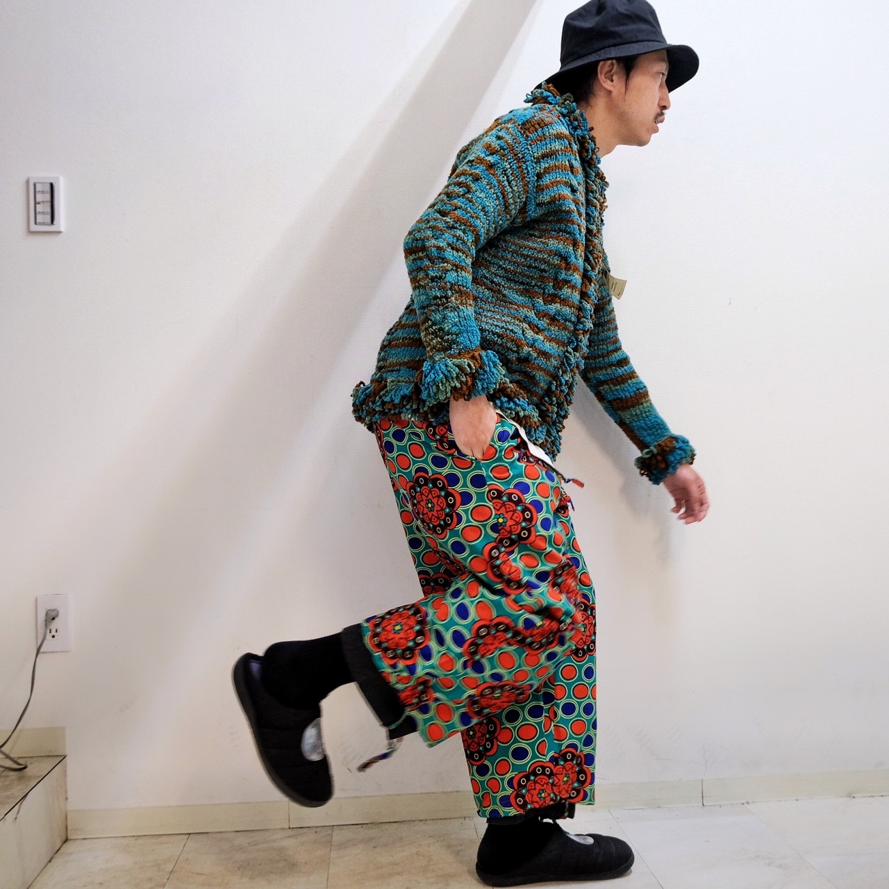 敢えてのクロップド丈にワイドなシルエットは主張の強いこな柄に最高に良いカタチ。