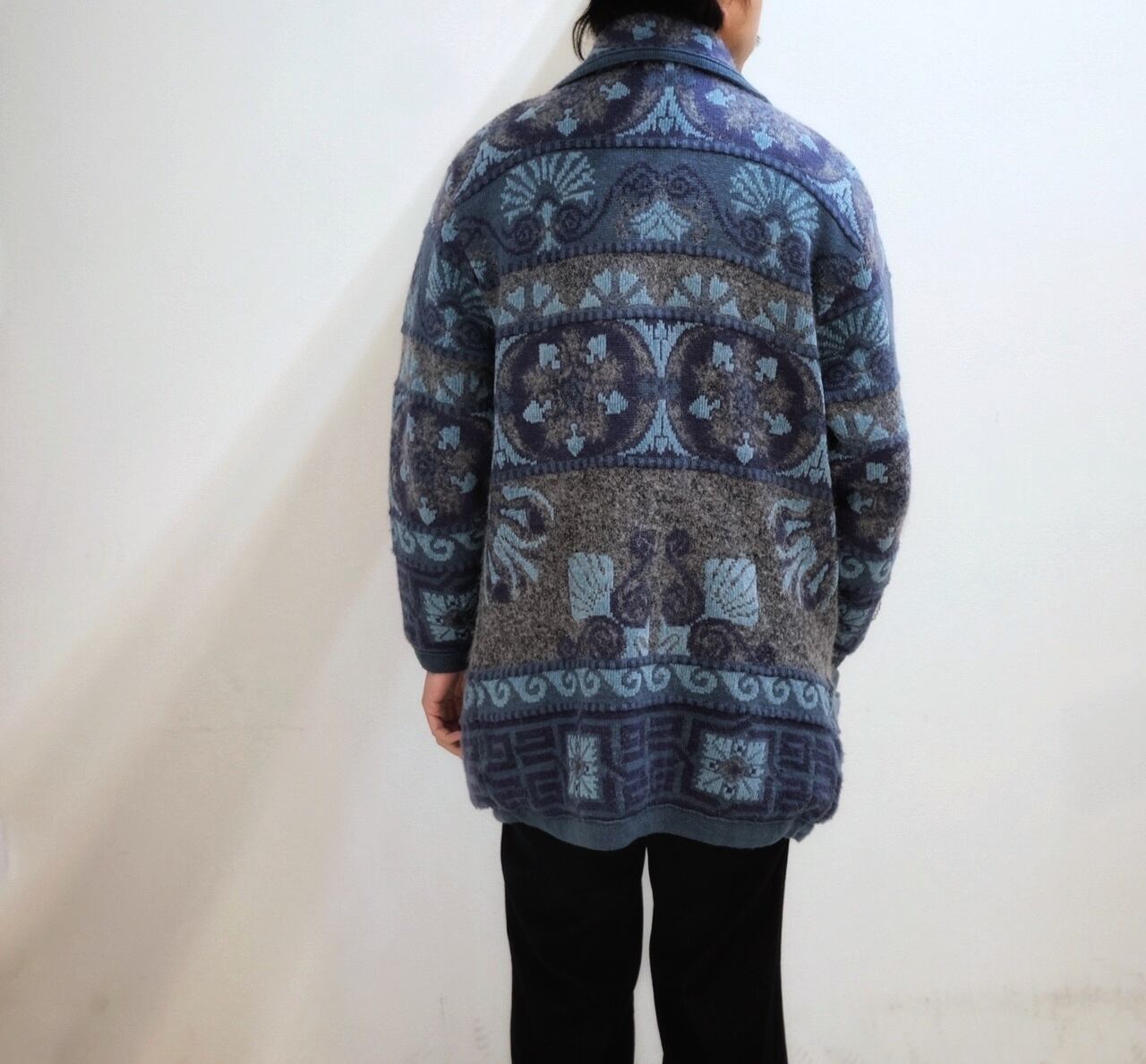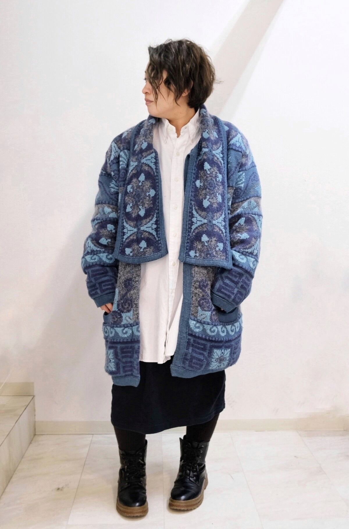 マフラーの様な襟のデザインが目を惹き、十二分に存在感あるガウンコートとなっております。