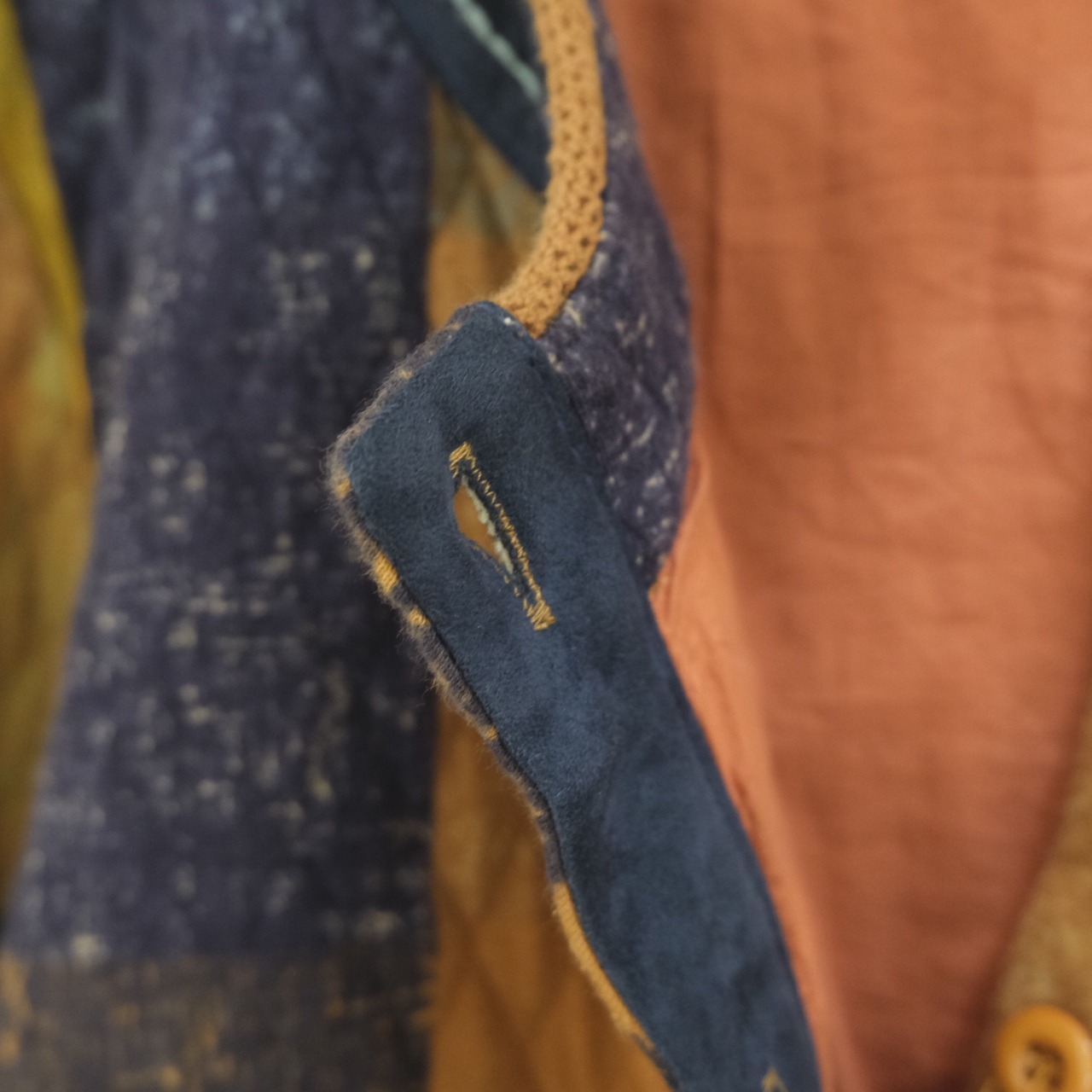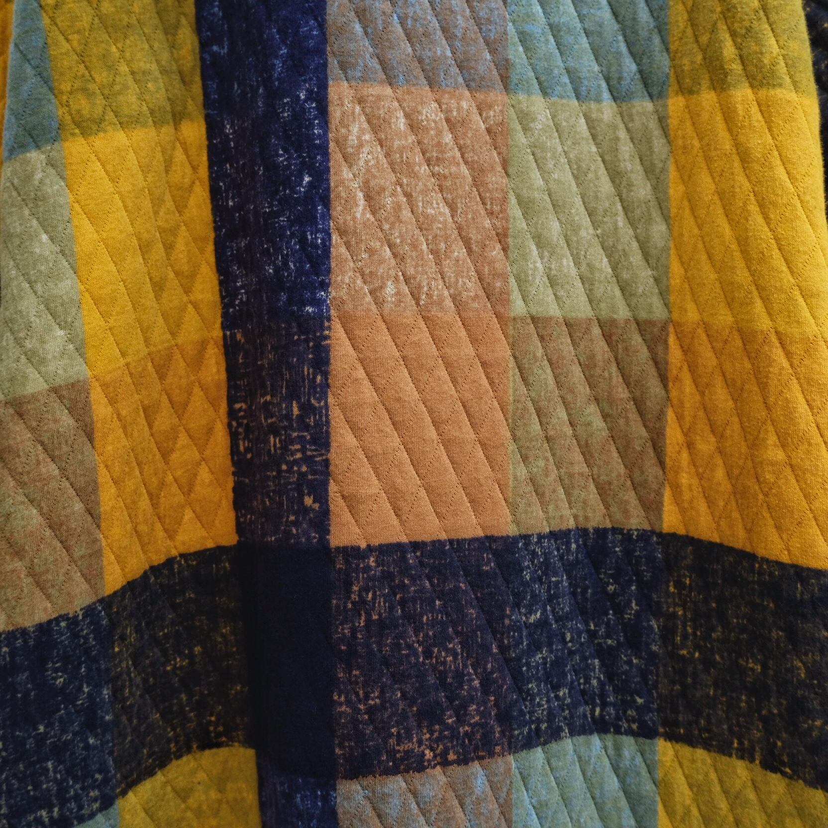 大判なチェックの上にネイビーのチェックを重ねているので、色の交差部分が下の色と混ざり合い、染め物の様なデザインになっております。