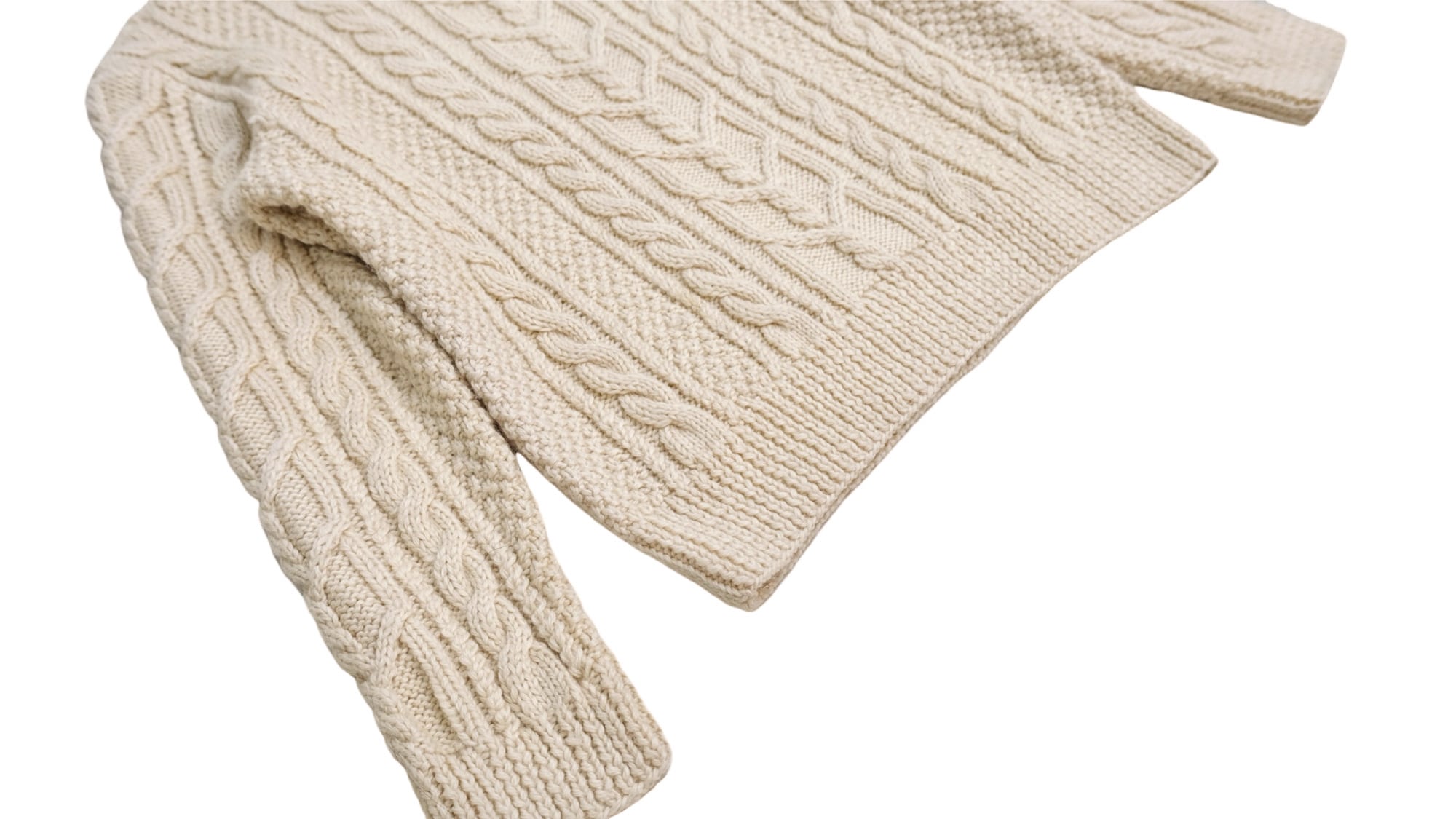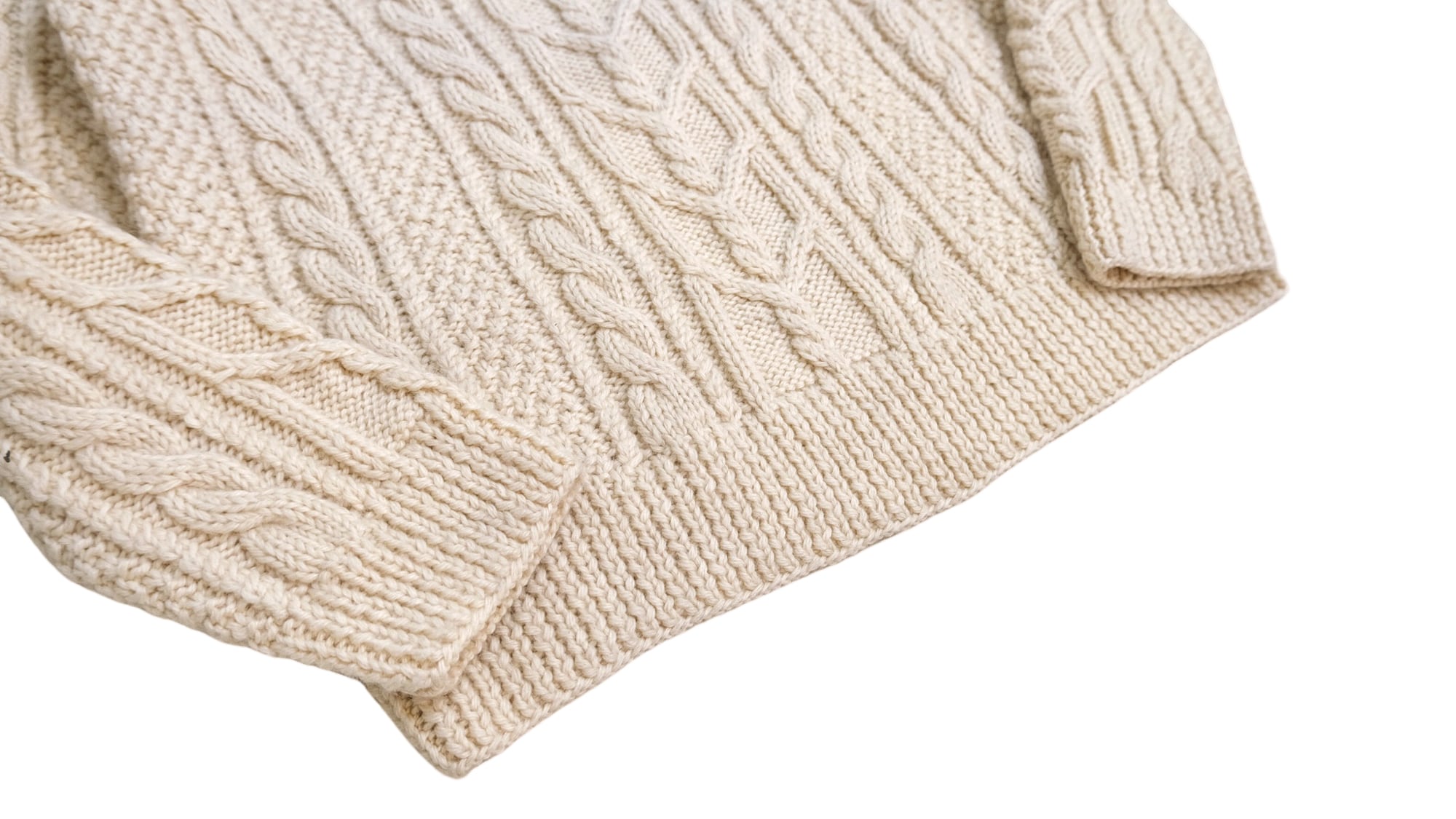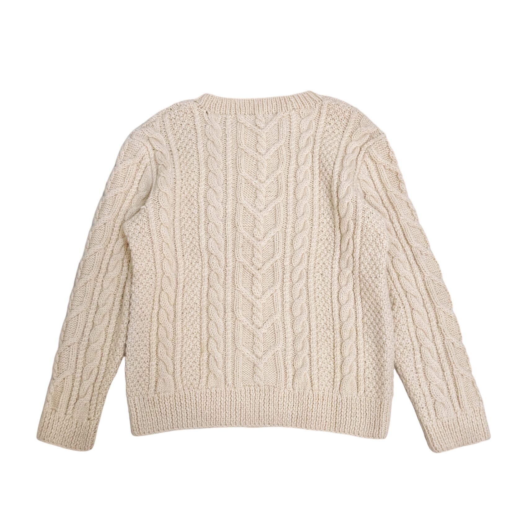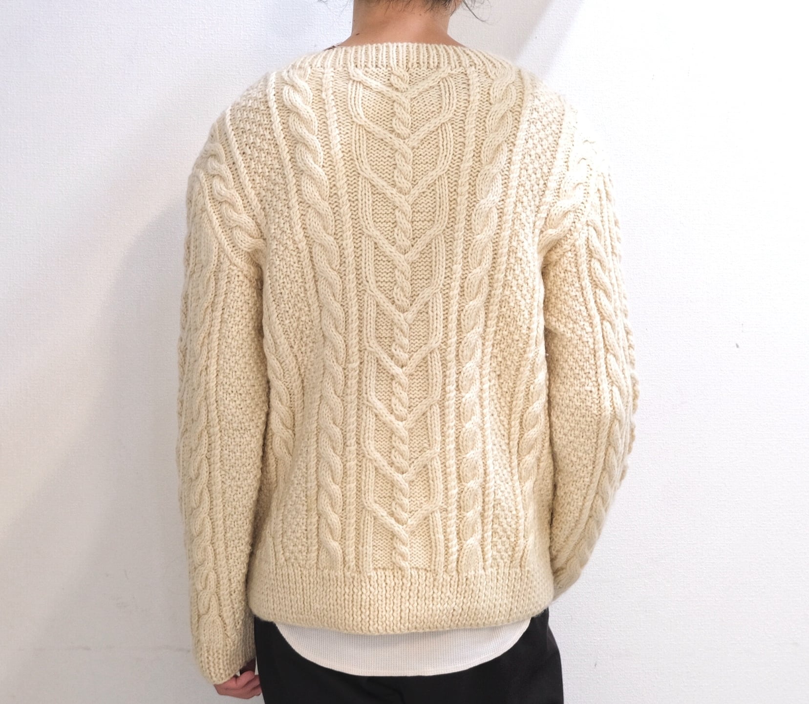 完全手織りのアランニット。他のニットとは比べ物にならない超絶肉厚のローゲージアランニット。カウチン並の肉厚さがあるからこそ編み目の圧倒的な存在感。
