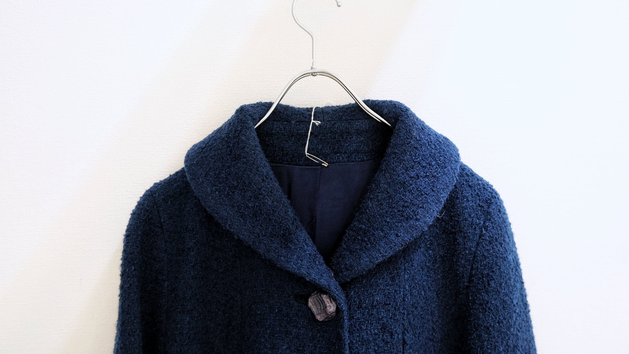 毛足の長いウールはカールしており、刺さる感じがないから肌触りに優しい。その上、裏地にはちゃんとビスコースが張ってあり、薄手でもストレスのない着心地です。